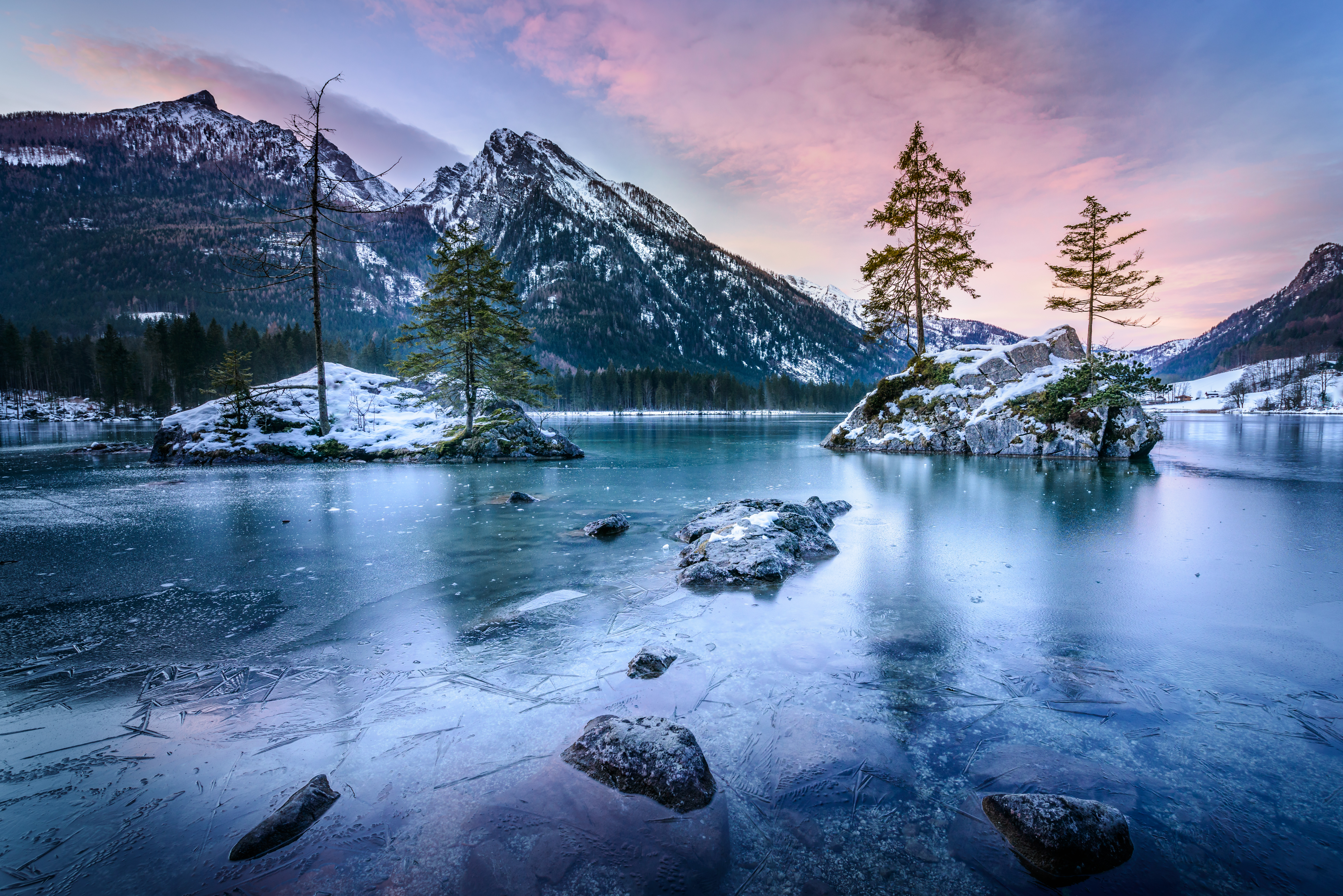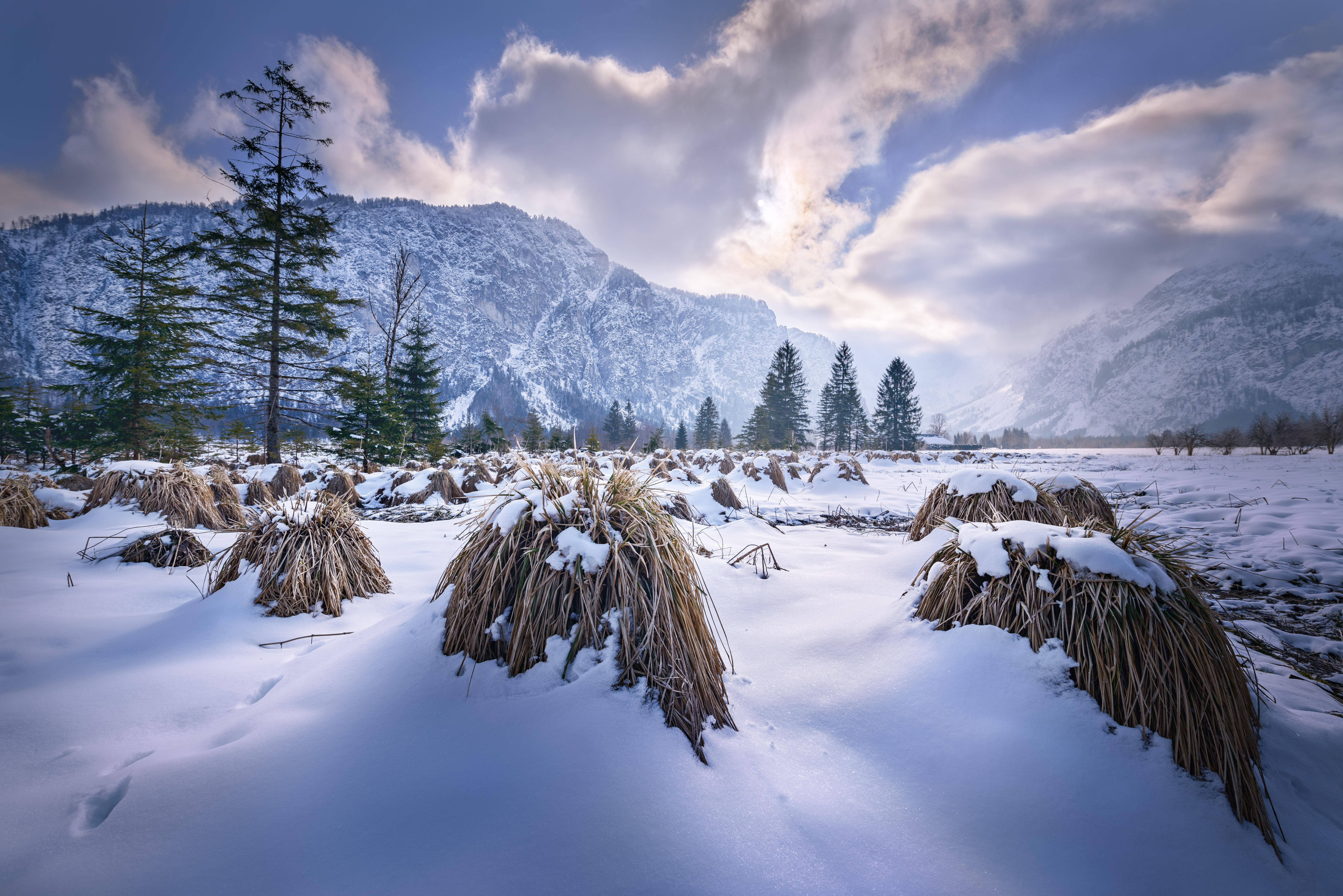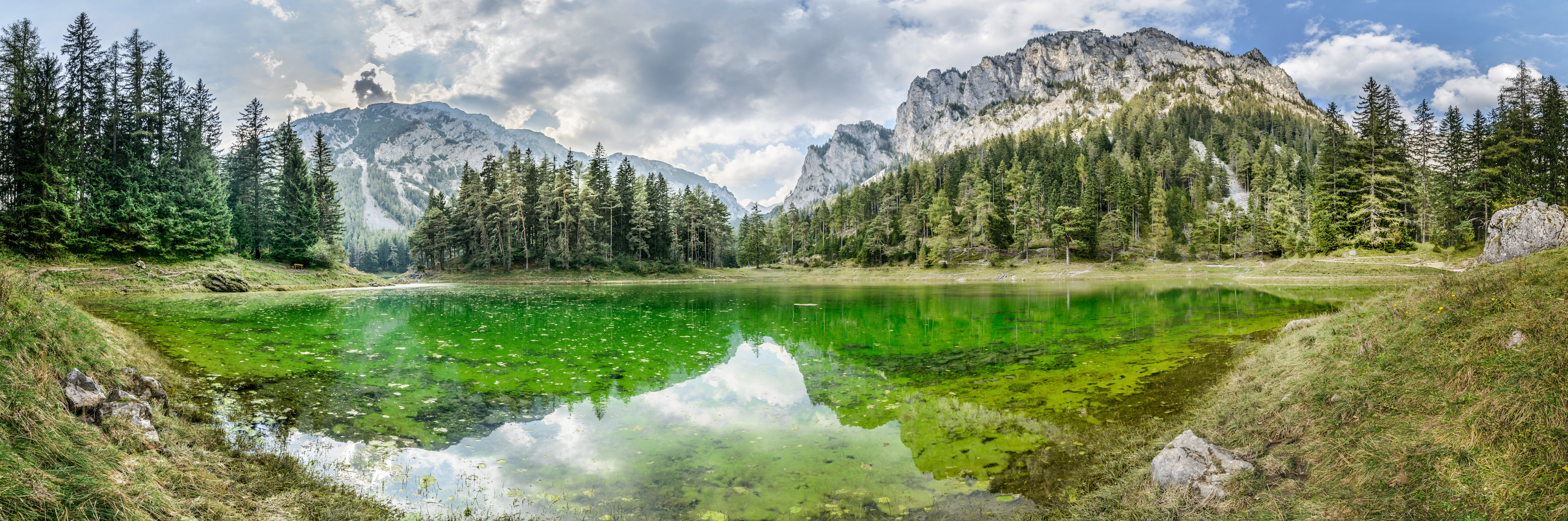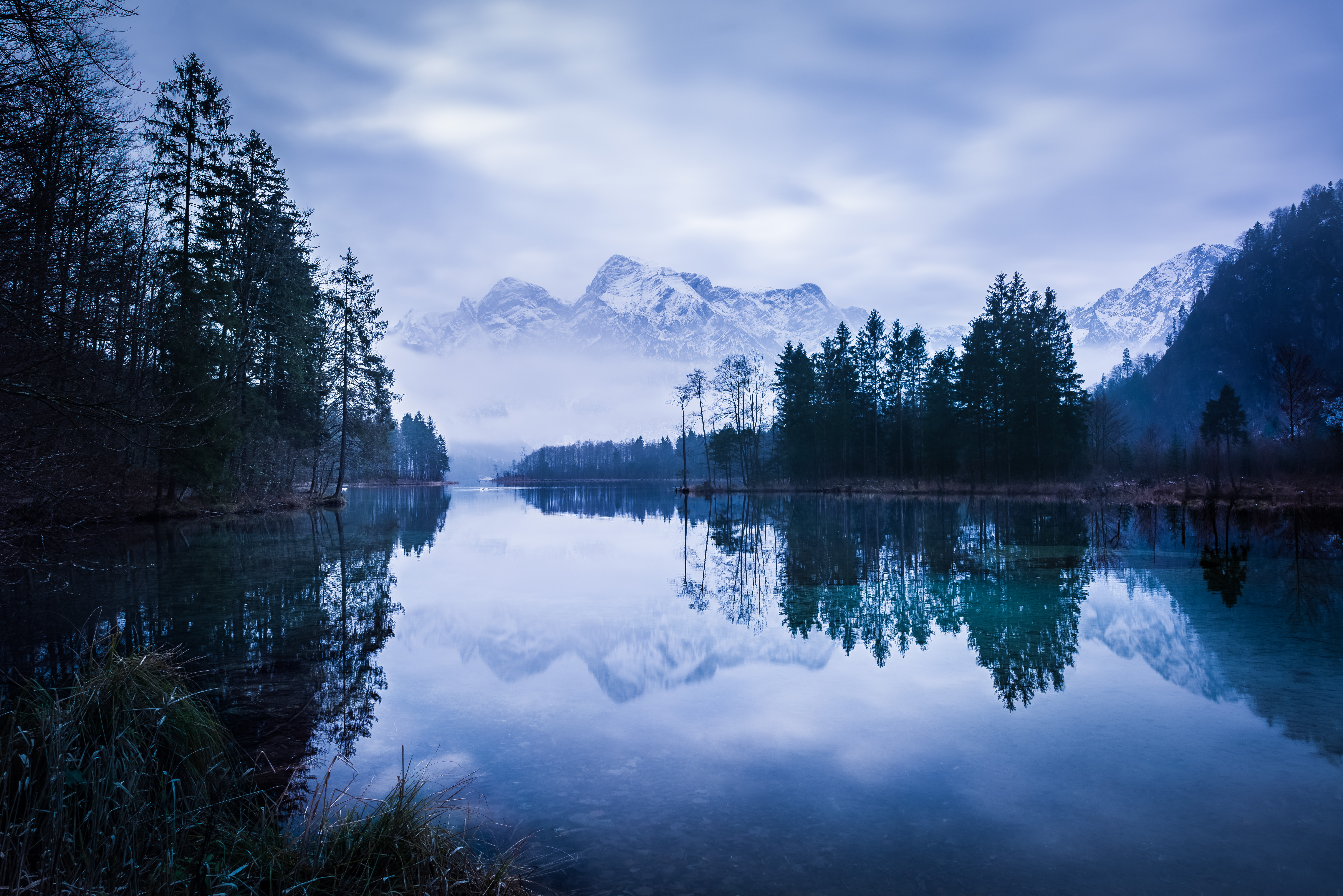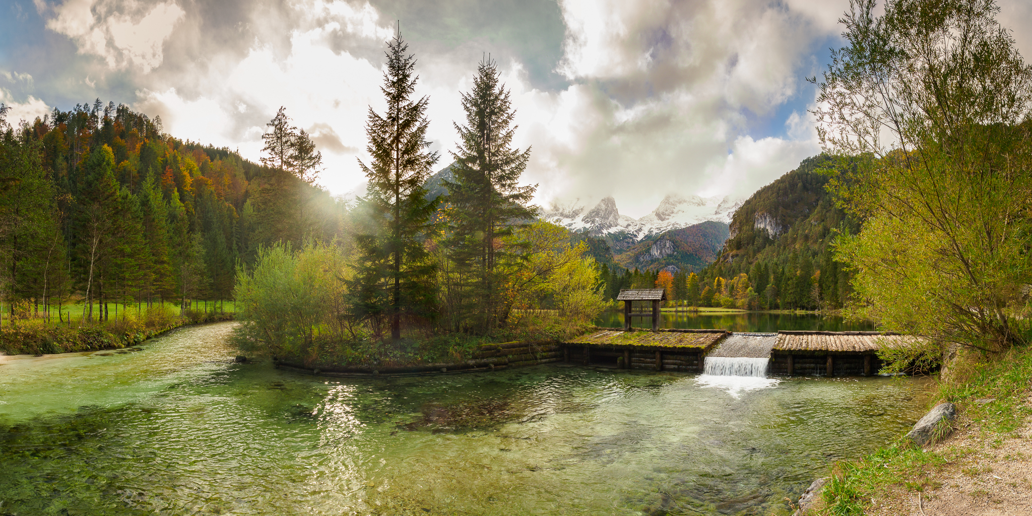 Schiederweiher pond in Hinterstoder. In the background there is already fresh snow while indian summer is going on in the valley.