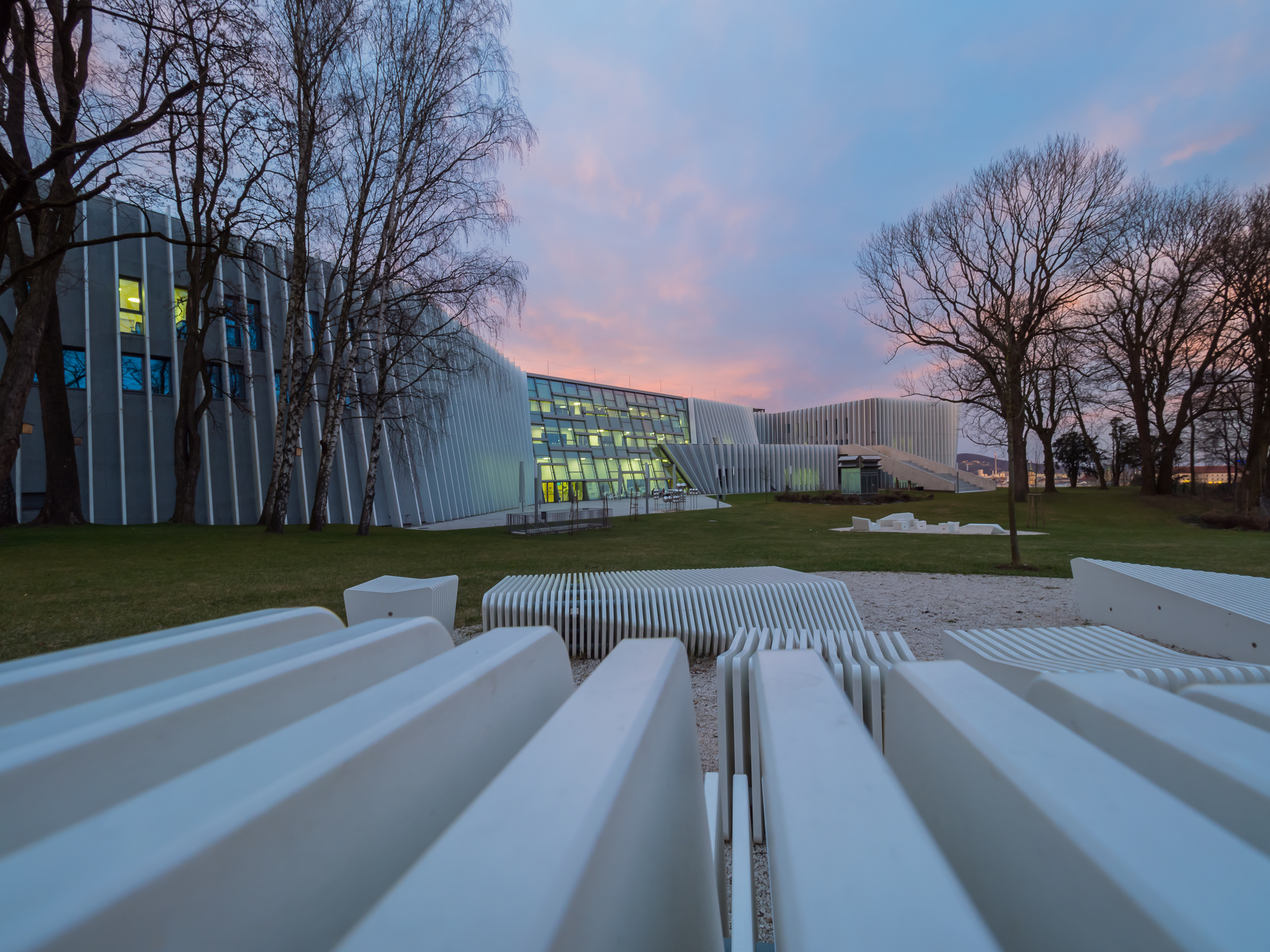 Die Bruckneruni von den Parkbänken aus gesehen.